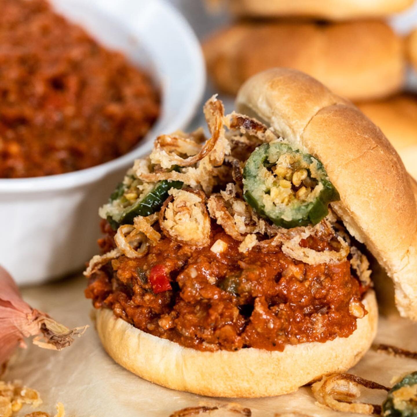 These aren’t just any ol’ sloppy joe you had as a kid. My version has been “adulterized” by adding flavors of red wine vinegar for some tang, red wine for depth, San Marzano tomatoes because… they’re the best, red peppers for texture and sweetness, jalapeños for a little kick, and THEN topped with freshly fried crispy shallots & jalapeños to bring it all on home to Flavortown (totally felt like Guy Fieri writing that).
